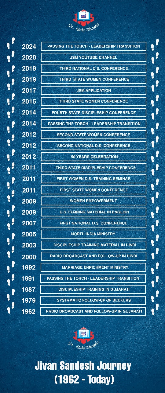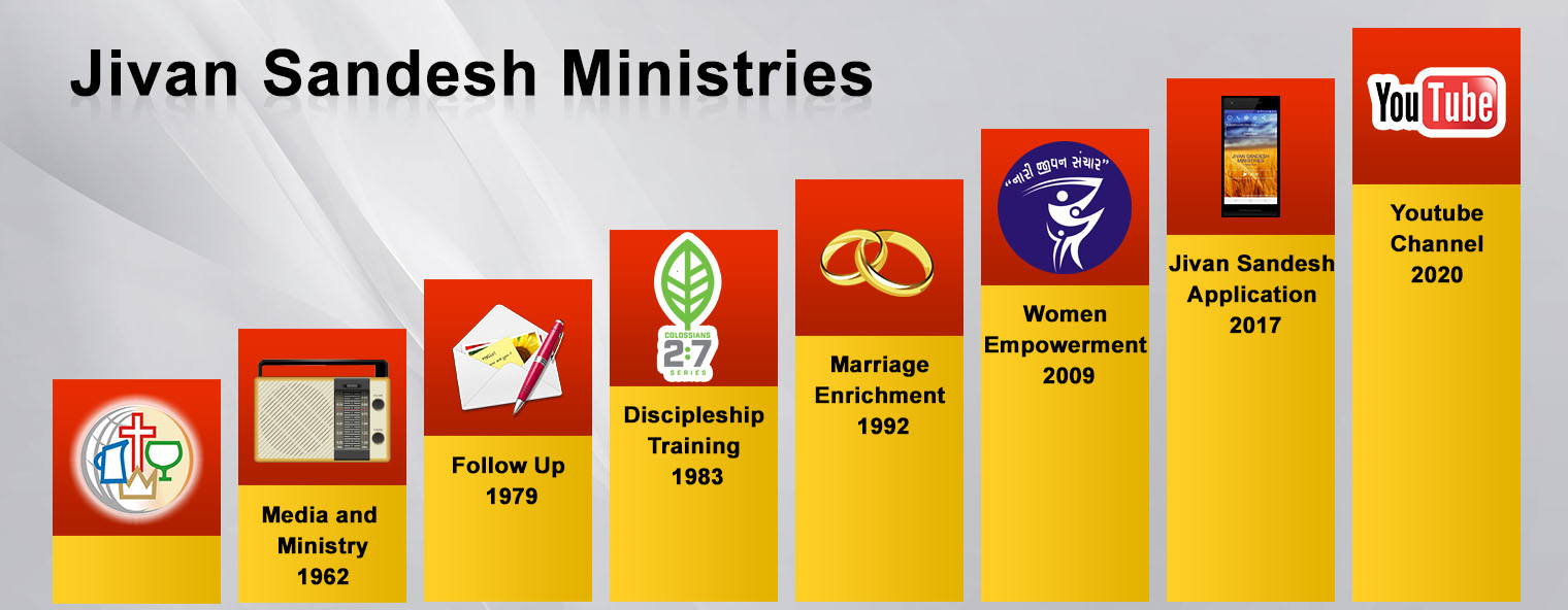 A small seed of a 15 minute Gujarati Radio Broadcast was planted by The Christian and Missionary Alliance in October 1962 under the leadership of Rev & Mrs. Elmer Entz to spread the good news of peace, joy and love. Thus Jivan Sandesh Ministry (JSM) was born in October 1962.It began to grow by the grace of God. We began our Hindi Radio Broadcast in 2000 along with Gujarati broadcast. At present we are producing three Gujarati and two Hindi radio broadcast of 15 minutes each per week. In1979 a systematic teaching program was developed to help those who wanted to know more about the good news of the gospel. Over the years it was developed in to six different levels follow-up program in Gujarati and Hindi languages.